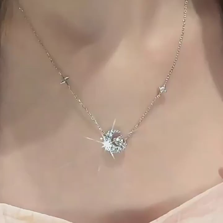 The pendant features a dazzling Heart-Cut Moissanite gently nestled within a crescent moon made of graduated round stones. To complete the celestial look, the delicate chain is adorned with two sparkling "North Star" charms, adding a touch of magic to your neckline.